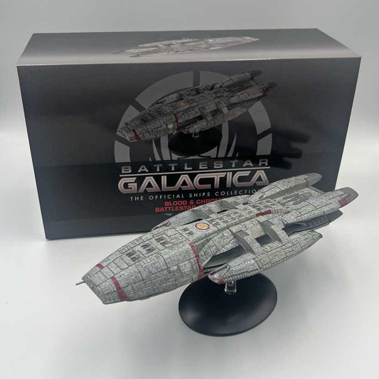 This model, from Battlestar Galactica: Blood & Chrome shows the Galactica in its prime during the First Cylon War, when it had more gun turrets and heavier armor plating.