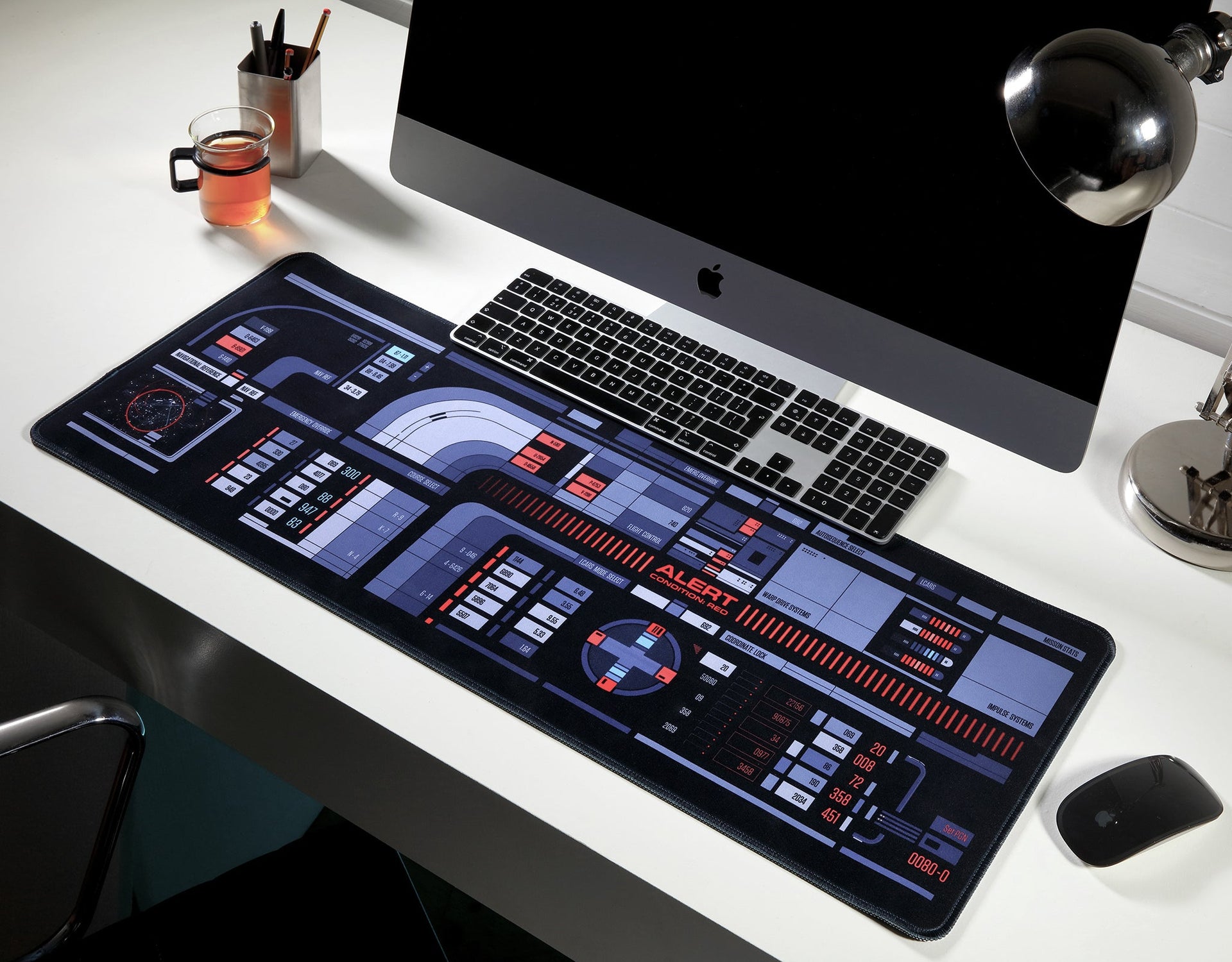 Turn your desk into the bridge of a starship with this extra large desk mat, designed to sit under your keyboard and mouse. The mat uses artwork created for the Conn station on the U.S.S. Stargazer in Season 2 of Star Trek: Picard, and it's almost impossible to resist tapping it as if you were pressing the buttons.